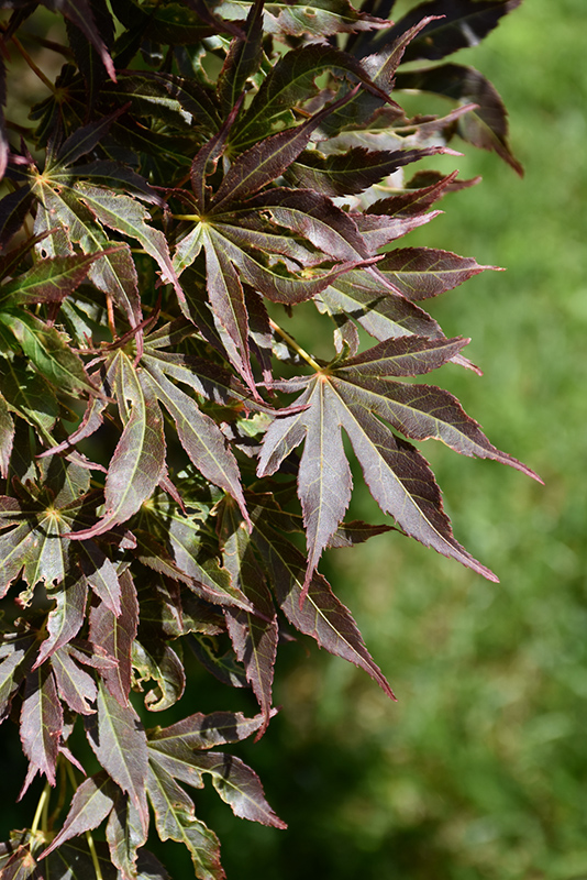 Tsukushigata Red Japanese Maple has attractive dark red foliage with dark green veins on a tree with an oval habit of growth. The serrated lobed palmate leaves are highly ornamental and turn scarlet in fall.