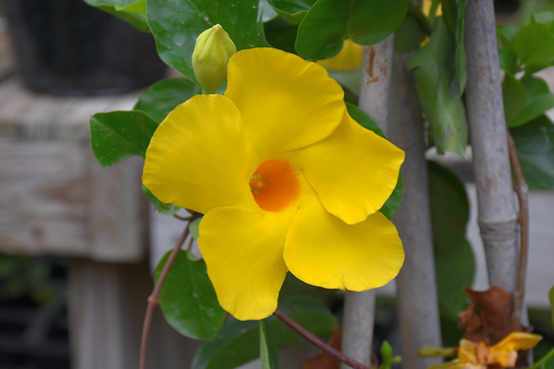 Yellow Mandevilla features bold yellow tubular flowers with orange throats along the branches from late spring to mid fall. Its glossy pointy leaves remain dark green in color throughout the year.